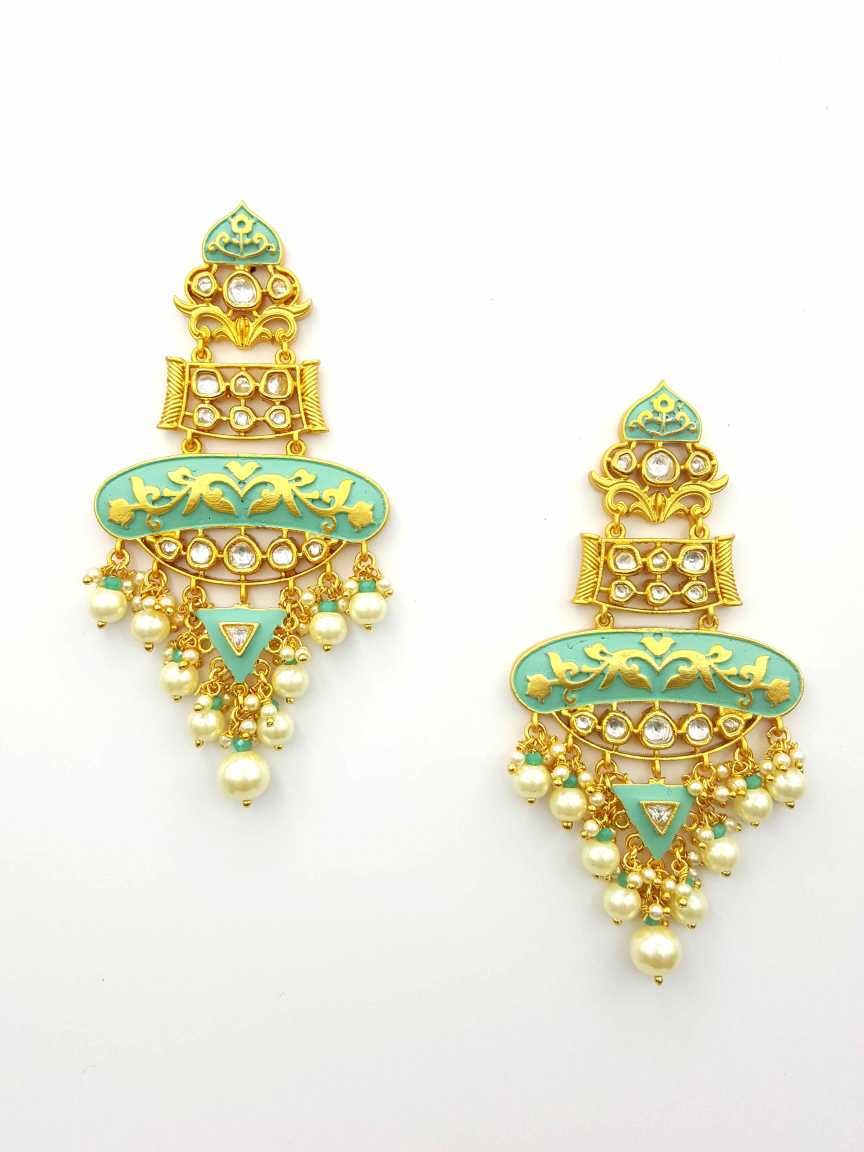 MAKE A STATEMENT WITH THIS BEAUTIFUL EARRINGS WITH A SIMPLE YET STYLISH VILANDI KUNDAN. WE HAVE MADE THIS PIECE IN BLUE, BROWN, MINT GREEN, PINK, WHITE COLOR ARRAY. IT HAS A LUSTROUS HIGH GOLD COATING CRAFTED FROM HIGH-QUALITY BRASS & COPPER ALLOY. WHETHER YOU'RE DRESSING UP FOR A WEDDING OR A CULTURAL EVENT, THIS EARRINGS ARE SURE TO IMPRESS.